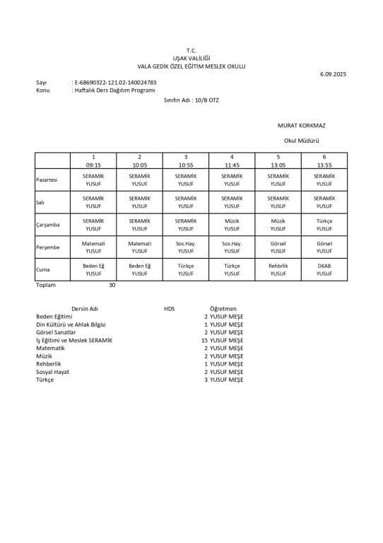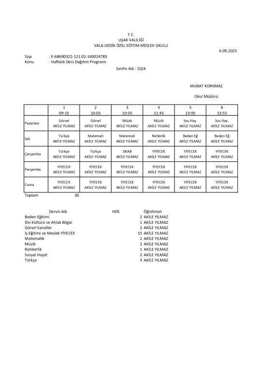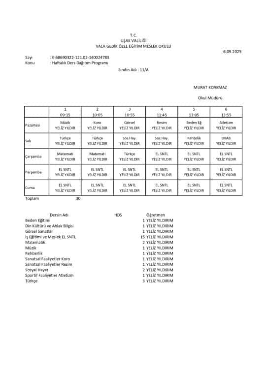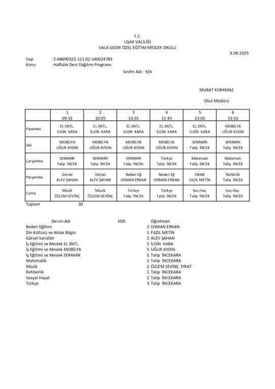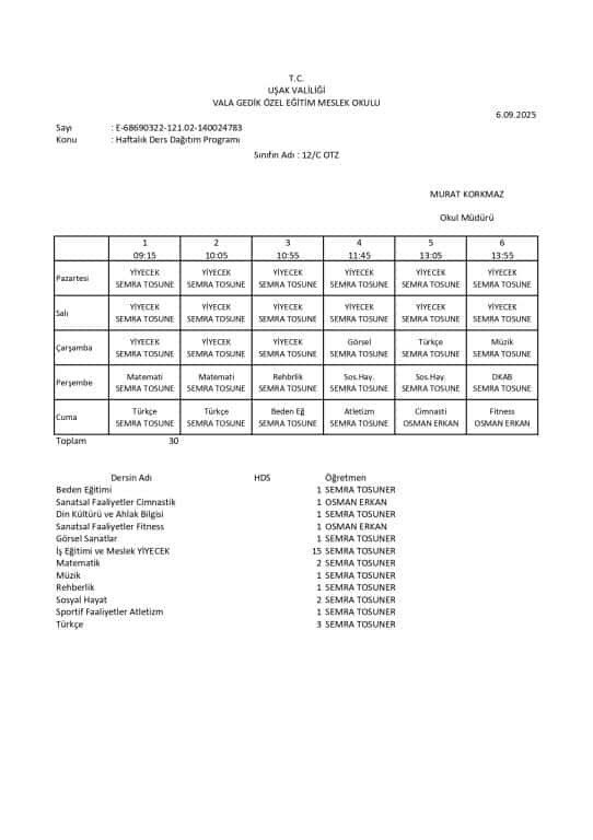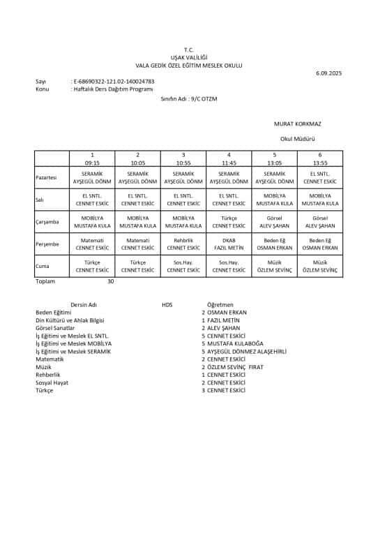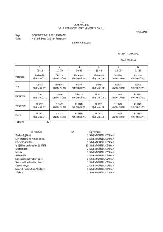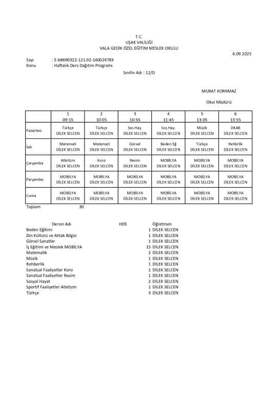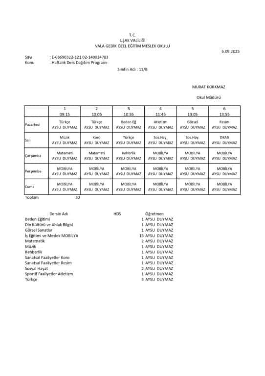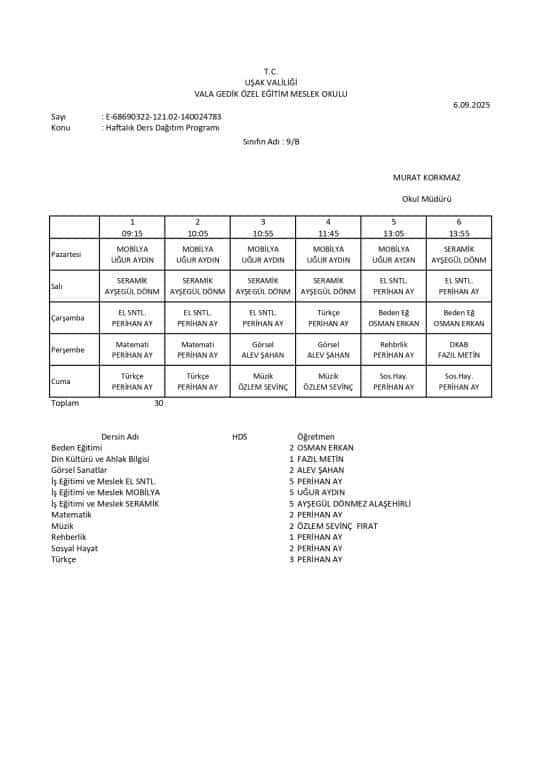 Haftalık Ders Programı